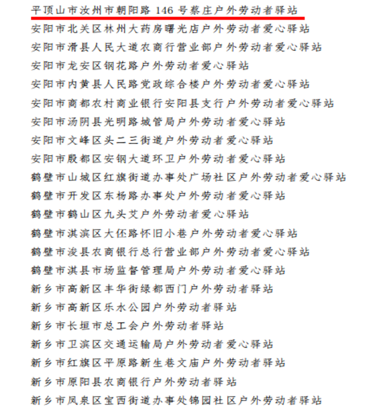 据悉,中华全国总工会办公厅发文确认全国1500个工会户外劳动者服务站点为2021年“全国最美工会户外劳动者服务站点”。汝州市蔡庄户外劳动者驿站是汝州市唯一入选站点。