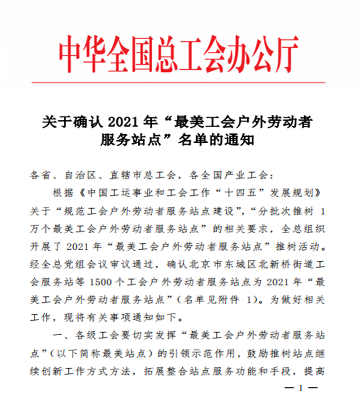 喜报!喜报!喜报!蔡庄户外劳动者驿站被中华全国总工会评为2021年“全国最美工会户外劳动者服务站点”